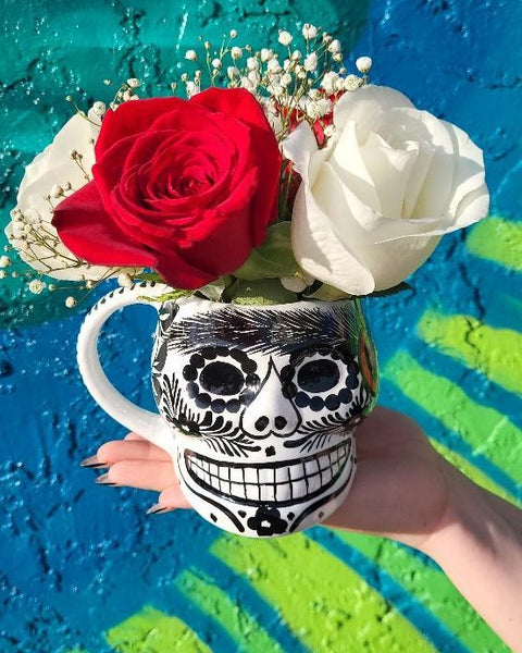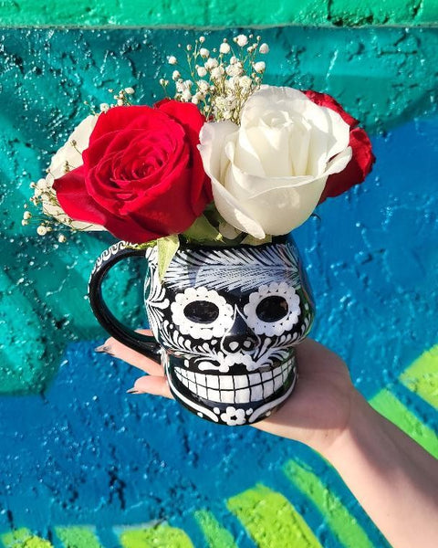 Purchase includes one "A Toda Madre" mug paired with a half dozen mixed red and white roses.