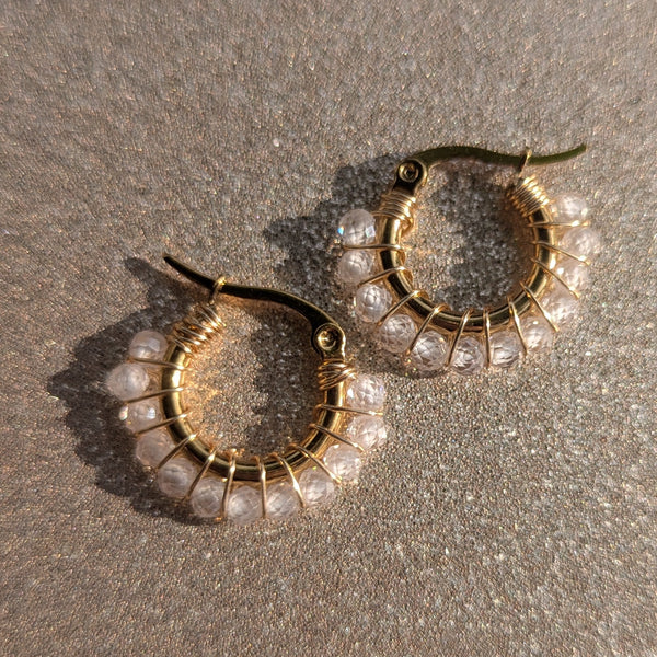 These lightweight, hypoallergenic hoops are stainless steel and adorned with Clear Glass Crystal beads. Each bead is individually hand wrapped with delicate precision.