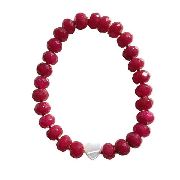 Stretchy raspberry Jade beads featuring Mother of Pearl heart detail.